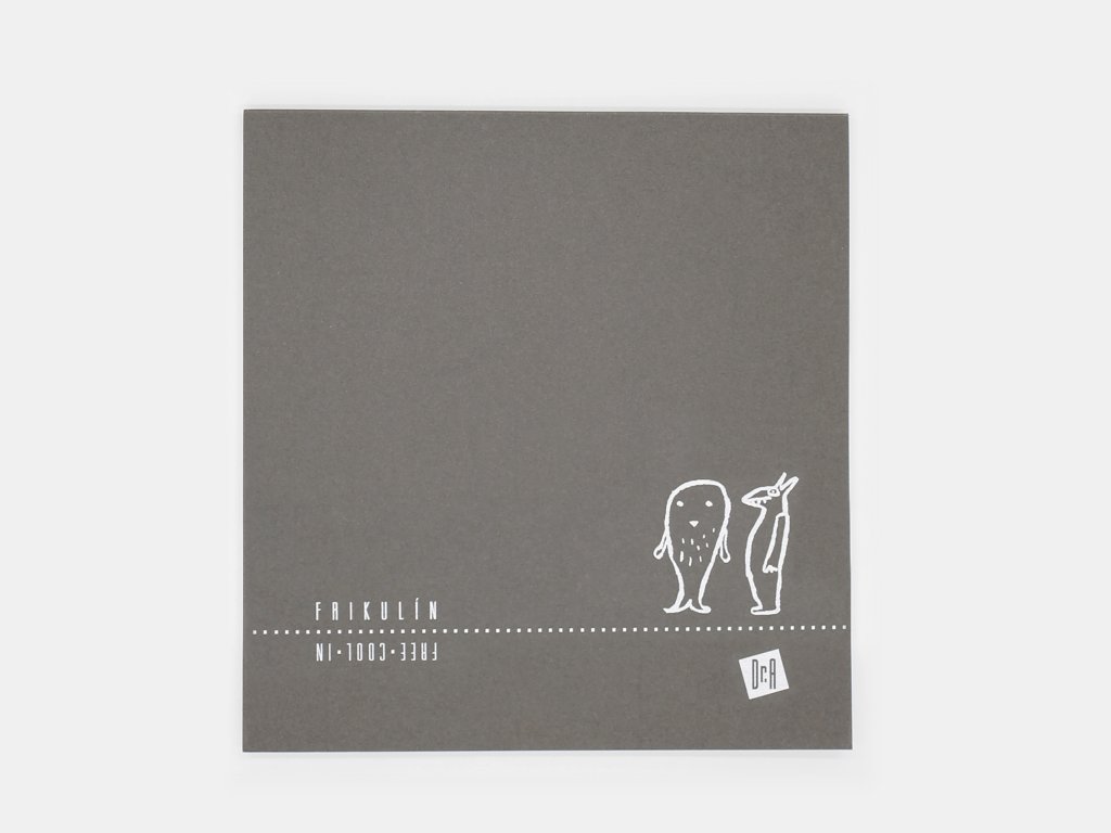 Přírodní karton obálky je šedě probarven ve vlákně s jemným bílým potiskem Frikulínů Ládi Sýkory.